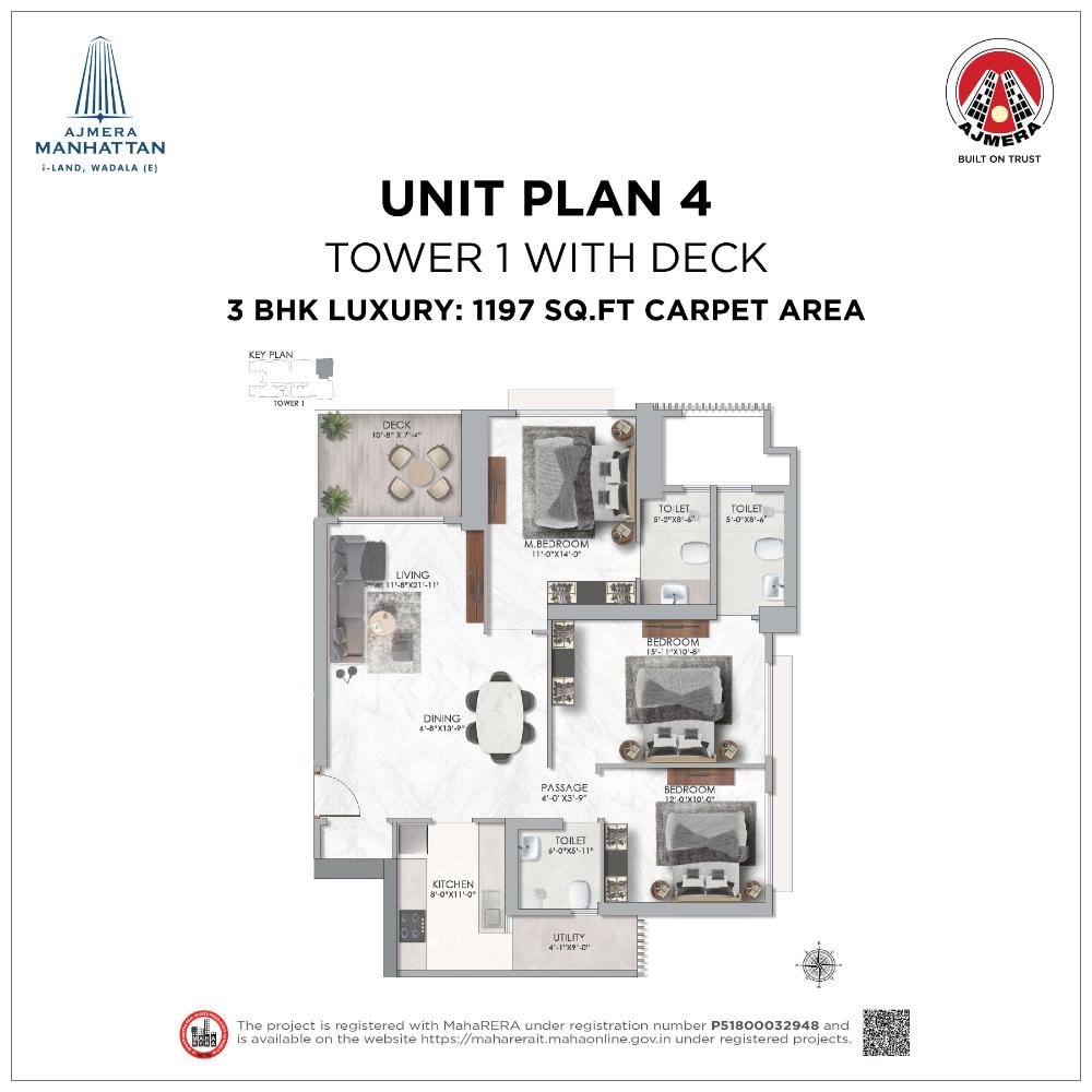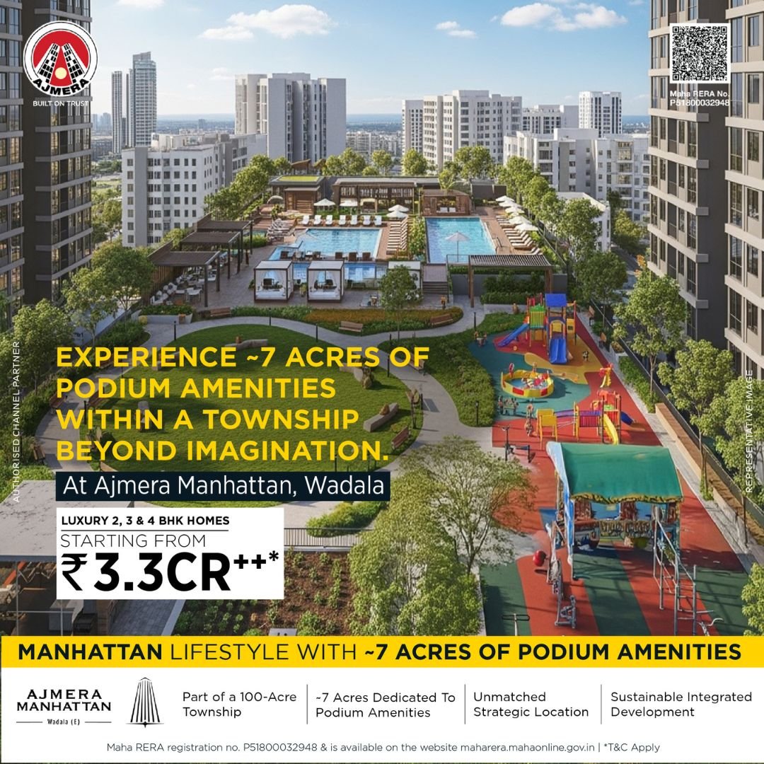 Ajmera Manhattan at i-Land, Wadala East is a landmark, Manhattan-inspired township by Ajmera Realty spanning a vast 100-acre estate and offering premium 2, 3 & 4-BHK Sky-Deck residences designed for sophisticated city living. The masterplan blends expansive green space (including Bhakti Park) with an unrivalled, nearly 7-acre podium of lifestyle amenities — curated spaces for wellness, leisure, sport and entertainment — all set beside IMAX / Bhakti Park and minutes from key city hubs like BKC and the Eastern Freeway.